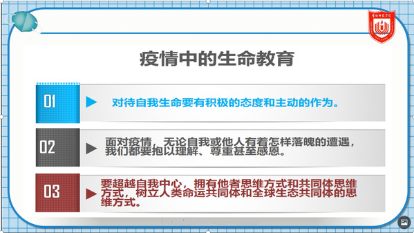 “疫情中的生命教育”这堂微课,主要分为三个部分,分别是“从传统的卫生概念探索生命的意义”“在疫情中体验生命的脆弱与希望”“疫情中的自我、他者与共同体”。