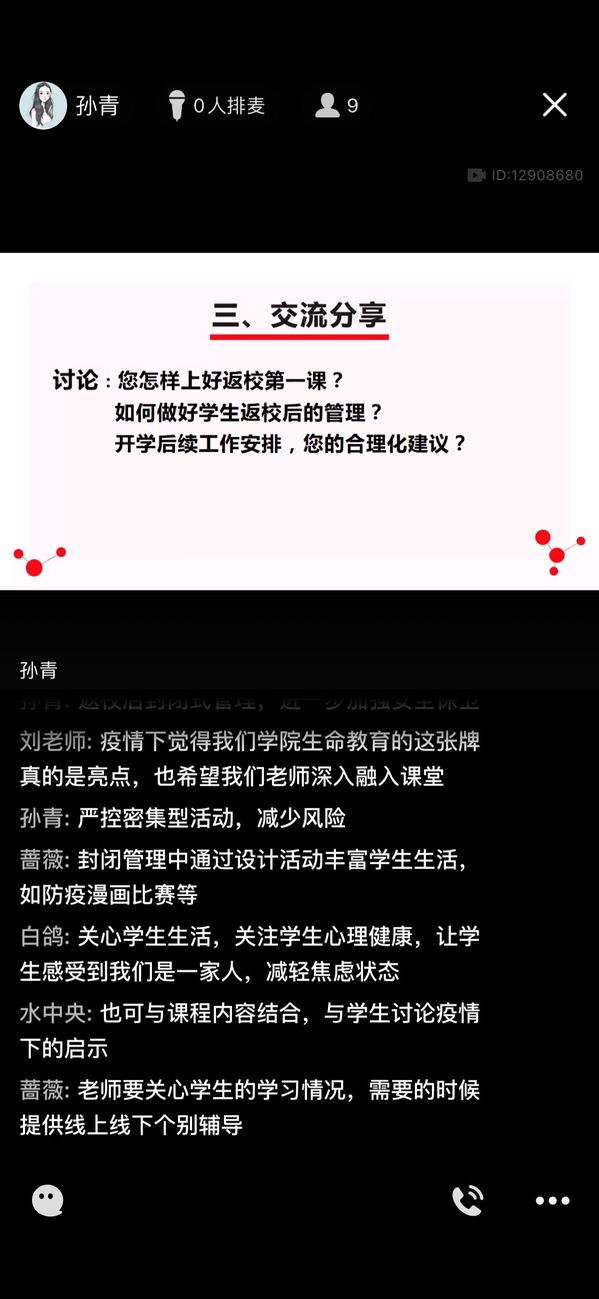 线上主题党日活动的开展,各支部结合自身的实际情况明确主题,组织实施。教科院三个教工党支部的线上主题党日活动以理论学习、传达上级精神、交流研讨、视频学习为主。线上主题党日活动主题分别是:教工一支部的主题为“争当抗疫模范,全力助推返校复学”,教工二支部的主题为“疫情防控、坚持到底;安全复学、志愿服务”,教工三支部的主题为“疫情防控,发挥党员先锋模范作用,保障返校复学”。线上主题活动分为四个环节,一是“不忘初心、牢记使命”主题教育常态化理论学习;二是学习疫情防控最新文件精神,重点学习了学校下发的《2020年春学期开学工作指导方案》等文件精神;三是就党员教师在员工返校复学后先锋模范作用发挥,以及保障学校复学复课后的疫情防控、教学管理等工作稳中有序地开展进行了交流讨论;最后,集中收看了“让党旗在防控疫情斗争第一线高高飘扬”:《别怕,我们在,加油》和《大爱传承携手前行》两段学习视频。员工党支部开展了“助返校复学,扬党员先锋”线上主题党日活动,分为三个环节,一是集体观看学习视频《疫情防控系列微视频》和战“疫”微视频《归来》、《渴望》;二是分享、交流、讨论自己观看视频的所思所想所悟;三是严格执行疫情防控纪律和返校要求,在保护好自己的同时,在服务同学、关心同学的过程中积极发挥员工党员的先锋模范作用。