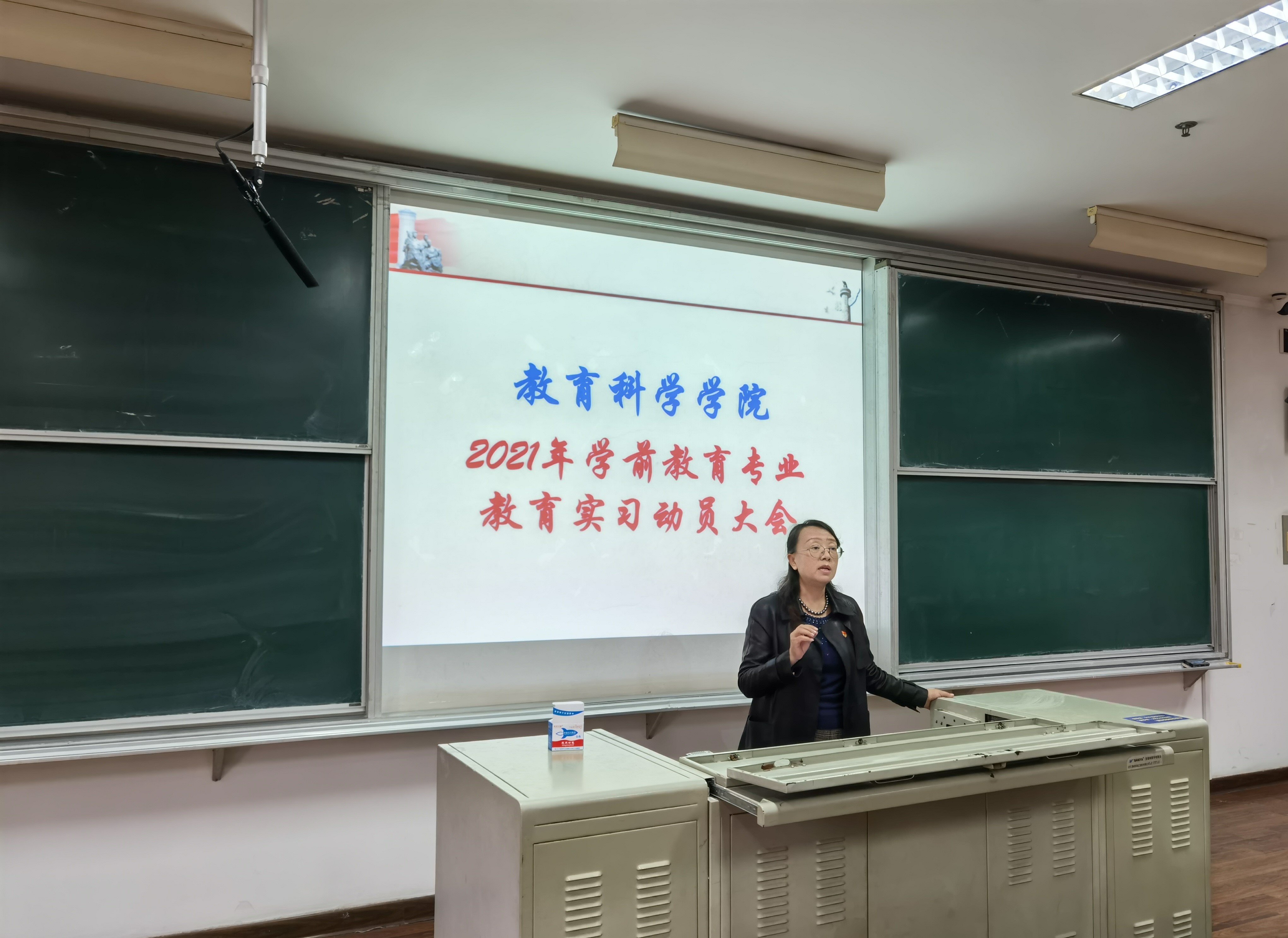 刘强书记对全体2018级学前教育专业师范生进行教育实习动员讲话。她指出,教育实习是我们培养合格的幼儿教师教育技能的重要课程,具有非常重要的意义。刘强书记介绍了实习单位的相关情况与实习方面的总体要求,针对实习生应遵守的职业道德和需重视的安全问题提出几点建议,希望实习员工珍惜实习实践的机会,怀有认真负责的实习态度和吃苦耐劳的工作精神,认真学习实践,为学校增光添彩。系主任孙青老师对教育实习工作进行了详细的部署,对员工参加教育实习的每个内容做了说明,希望全体实习生在教育实践过程中得到锻炼和提升,高质量完成实习手册要求的各项任务,并要求实习生遵守实习纪律,加强自我管理,并祝愿全体实习生学有所获,实习工作顺利,圆满完成实习任务。