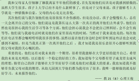 一学期结束,大部分大一新生都经历离家千里求学,再到从新踏进家门的过程这时“生活的烦恼可以和妈妈说说,学习的事情可以和爸爸谈谈”同学们在与父母进行交流的过程中,各种感想化作一行行文字,同学写到“在经历了那次刻骨铭心的谈话后,我们自己和父母)也越来越能理解对方。对于我来说,家永远都是我温暖的港湾家人之间永远都是双向奔赴的爱。也有同学提到妈妈的话女儿,你是妈妈的孩子,这种血缘关系是前世修来的,是上帝赐予的,妈妈非常珍爱,妈妈想做你坚实的后盾,更想做你的朋友,最亲密最要好的朋友妈妈知道你是一个懂事,乖巧,善解人意的孩子,妈妈相信,我的女儿会越来越成熟,越来越懂事,你是妈妈的骄傲,妈妈真的为你自豪很多同学由谈话想到了自己的成长经历,想到了父母的付出,在同学们的字里行间,我们觉得当初设计这一活动的目标达成了。