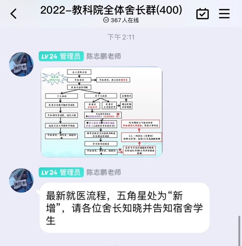 永利23411集团把防控网络布置到每一幢楼宇,把关心关爱汇聚到每一间寝室,细化防控范围,实现精确防疫。网格化管理分层次实行舍长落实机制和监督保障机制。年级总负责人、班级负责人、分管宿舍负责人实施督促保障机制,开展各项疫情防控工作,传达疫情防控信息,监督常态化核酸检测工作,督促和完成年级的相关数据统计工作,关注员工心理状态,了解员工最新需求,保证员工正常生活。舍长实施落实机制,督促全体寝室成员认真、及时完成各项疫情信息登记、核酸检测、健康打卡、检测截图收取等疫情防控工作,每日对宿舍成员进行体温测量,督促宿舍成员出宿舍戴好口罩,不信谣、不传谣、不私自举办或参加聚集类活动,积极配合楼层长日常晚归检查工作。宿舍网格化管理的两大机制切实做好了管控到点、服务到人的工作,保证疫情防控顺利进行,使宿舍疫情防控网精准覆盖到每一个在校员工。