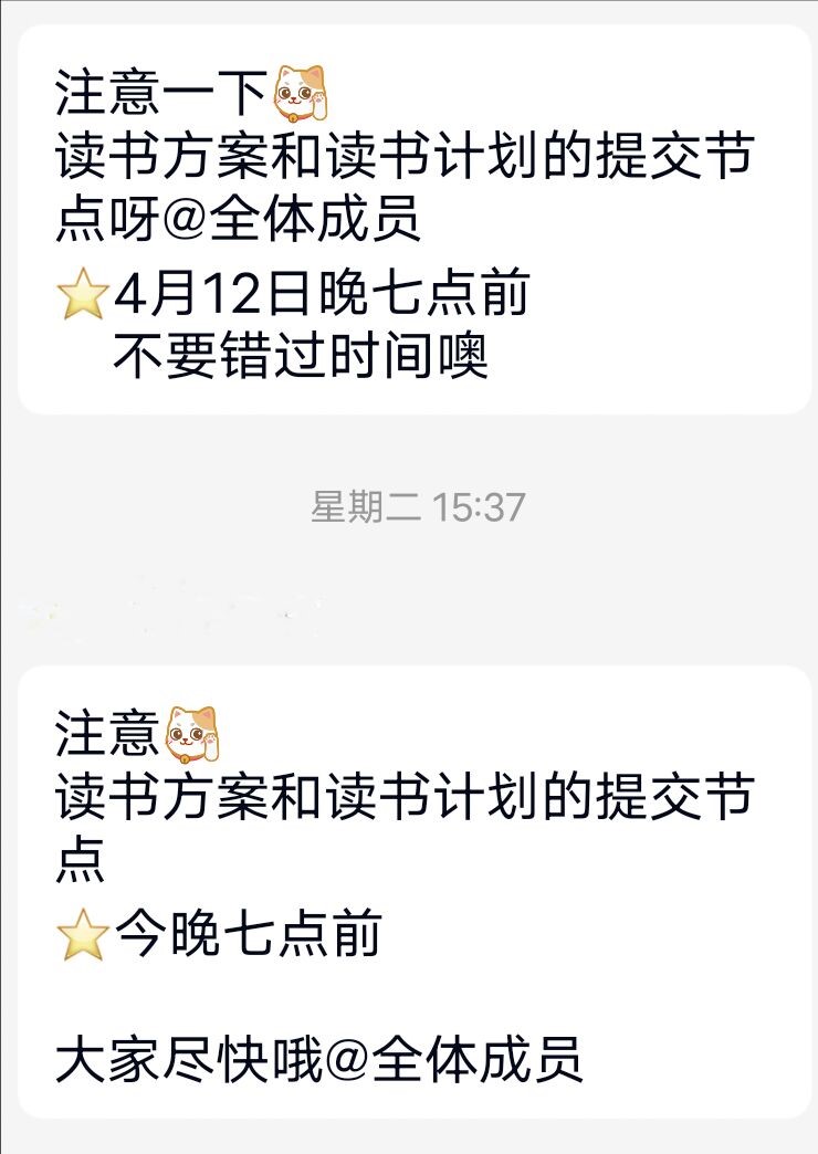 截至412日,收取报名小组成员名单及读书方案与读书计划的任务已完成。活动前期,工作人员认真负责,撰写策划与通知,建立相关活动群以便沟通。在通知下达后,各班宣传委员及时进群,询问相关问题,对活动认真负责。活动报名期间,同学们踊跃参与。临近截止时间,工作人员及时提醒,以防同学漏报忘报。材料收集完毕后,工作人员即刻整理汇总各班提交的材料,做好核对工作,推进活动进度。