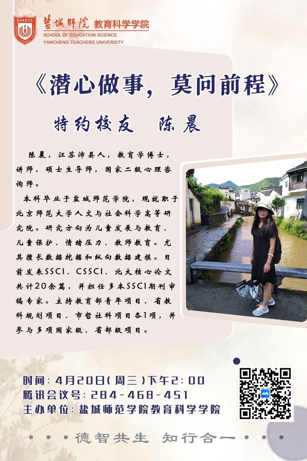为了切实加强疫情期间学院学风建设,营造良好学习氛围,强化组织育人功效,全面提高教学质量和人才培养质量,永利23411集团于4月20日下午两点开展了线上“潜心做事,莫问前程”员工讲座。¬本次员工讲座邀请了教育学博士、硕士研究生导师、2009级员工陈晨作为主讲嘉宾,由教科院学工办主任海英主持。