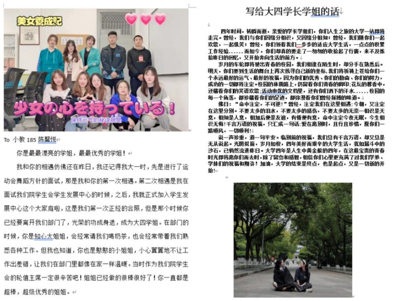 聚并不是开始,散也不是结束。六月炎炎送离别,将最好的祝福送予最好的人。毕业季来临,为了表达对学长学姐的感恩与祝福,号召同学们找一张同属于和大四学长学姐回忆的照片,并附上对他们想说的话,回顾过去,展望未来。