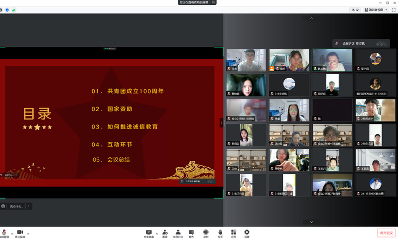 首先薛颖老师召集生活委员进行线上会议,讲解了活动内容。随后并在生活委员群中发布了活动通知和申报表。19、20、21三个年级各个班级积极参与,以线上线下不同形式展开活动,有的班级邀请了班主任参与班会,也有的班级为班主任主讲,向同学们传达了“诚信感恩,励志笃行”的主题。最后经过评选,选出了196、209、218三个优秀班级上报学校进行评比。