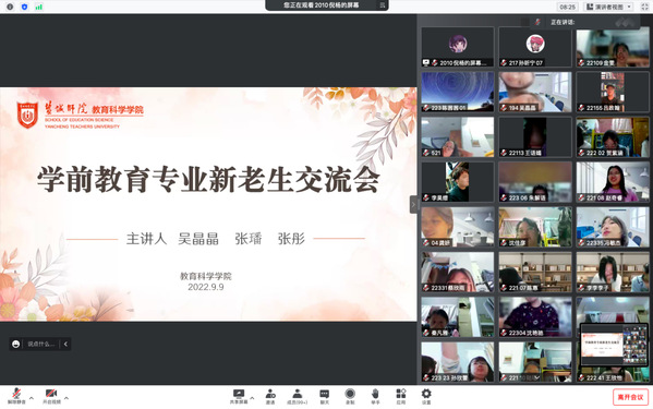 2022年9月9日晚,永利23411集团学前教育专业邀请吴晶晶、张璠、张彤三位学姐作为优秀员工代表,在腾讯会议为全体学前教育新生举行了“学前教育新老生交流会”。会议主要由三位学姐结合自己的老员工活,通过自己的反思总结,为新同学们开启老员工活提供了宝贵的经验。