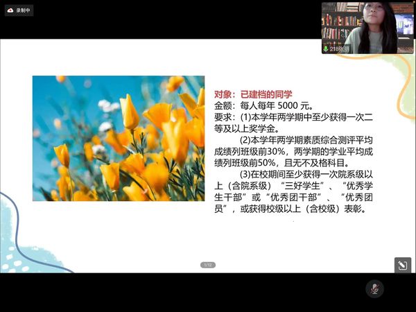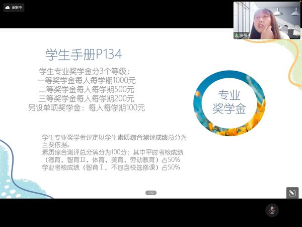 会议开始,首先由张彤学姐为同学们讲解奖学金的申请获得要求,学姐指出各项奖学金都与同学们的学业成绩和综测分息息相关,就比如一等奖学金获得者,素质综合测评总成绩、学业考核成绩均须列班级前6%,各考查、选修课程成绩不低于80分,其阶段考核成绩不低于80分。由此可见,奖学金的评定要求是十分严格的,不仅仅在于学习成绩方面,也更加注重在平时的活动积极参与程度上,全面发展才是老员工老员工活的追求。大学期间不松懈、阳光积极才可以获得较高的荣誉。