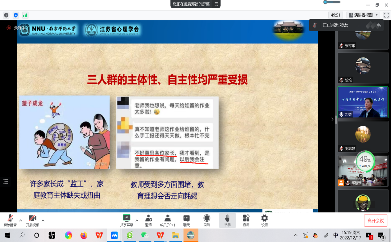 下午在云端召开了盐城市心理学会2022年学术会议。特邀江苏省心理学学会理事长邓铸教授做主题为《家校社教育责任的边界——“双减”“家庭教育促进法”与儿童生命健康成长》的学术报告。邓铸教授重点解读了“双减”政策和“家庭教育促进法”,从儿童、家长、学校、社区、政府等五个方面,提出要正确认知家校社主体责任边界及担当,并就“双减”要坚决推进教育生态治理等问题与会员代表进行了交流,与会代表纷纷表示讲座深入浅出,收获颇多。