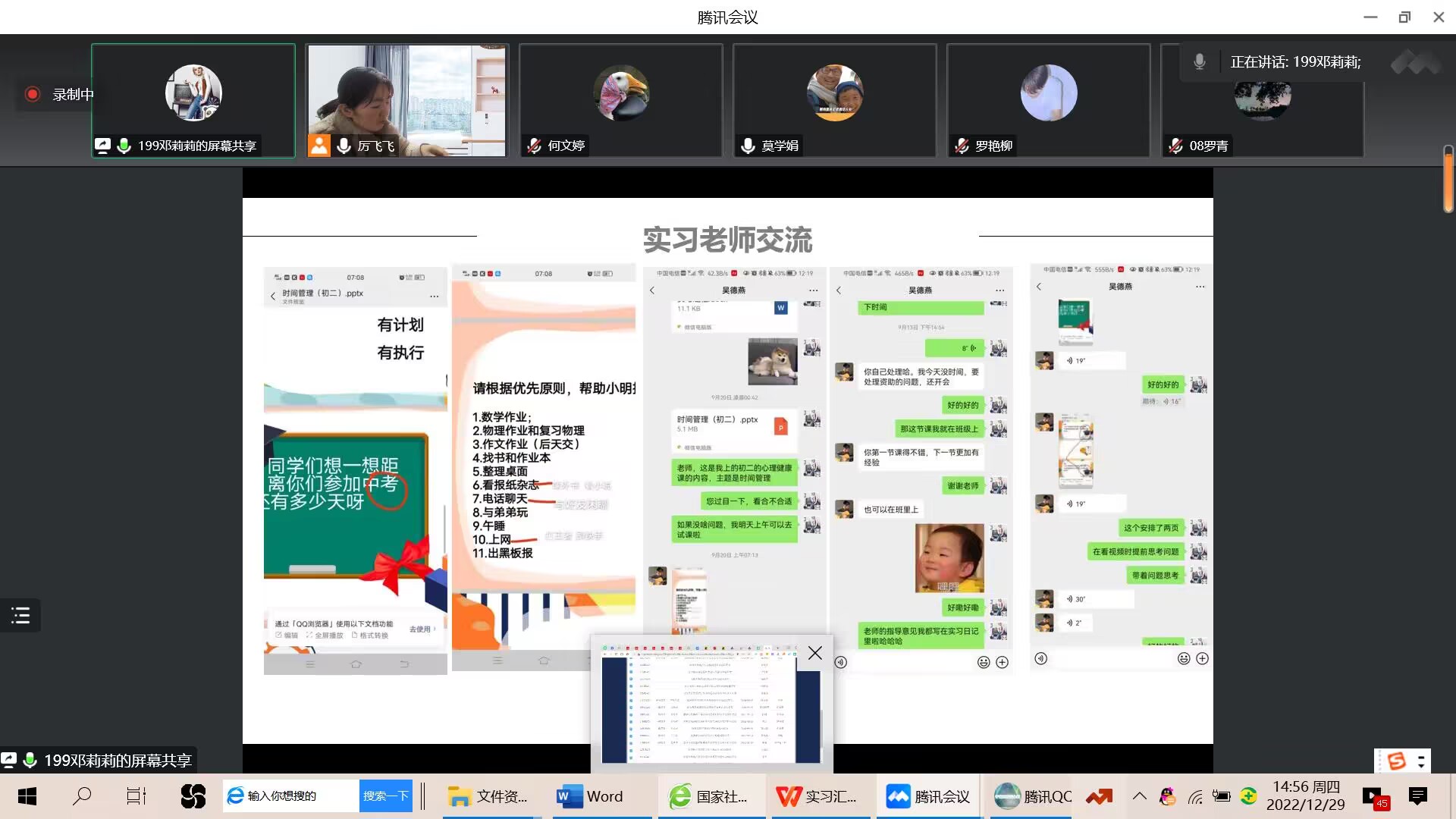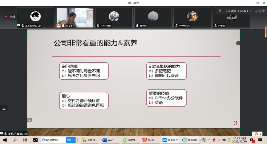 20221229下午心理学系在腾讯会议举行应用心理学专业2019毕业生实习成果汇报会,厉飞飞主持本次活动心理学系全体员工参与本次汇报实习汇报既是对员工实习成效的检验,也是提升应用心理学专业员工专业技能的重要环节。