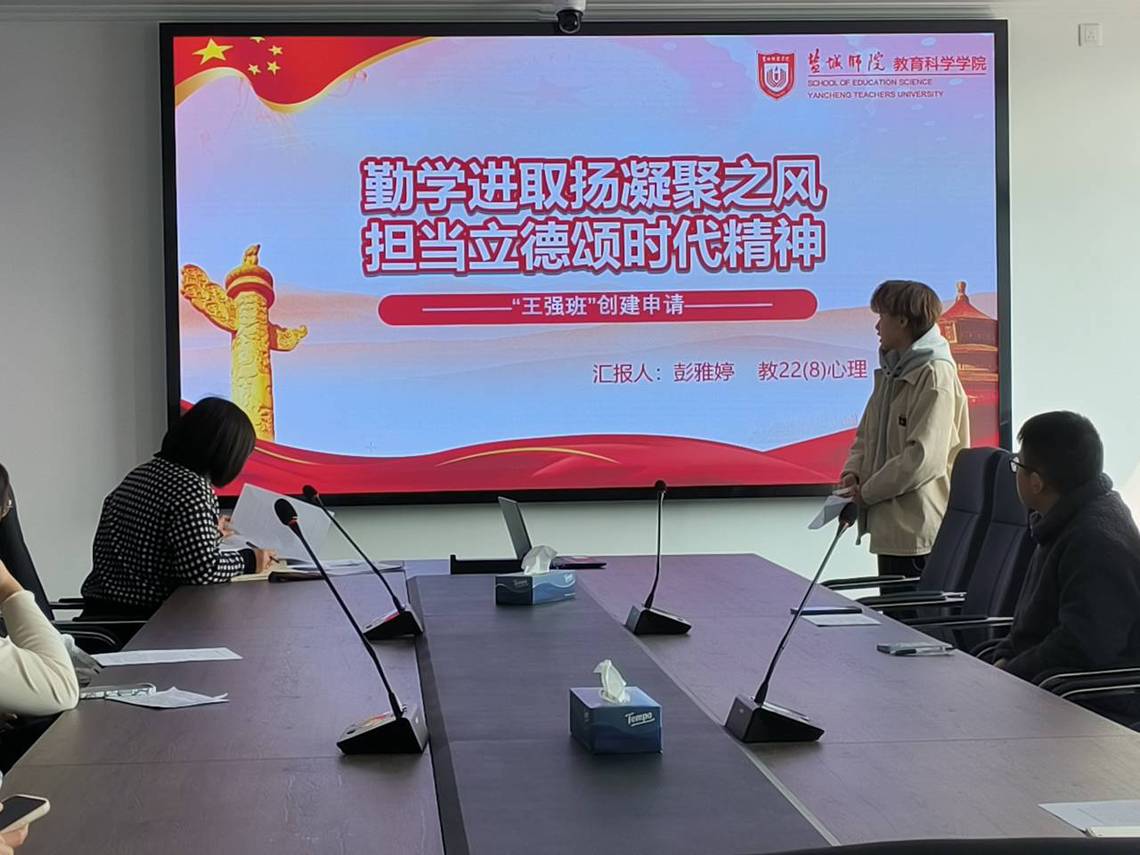 本次“王强班”创建申报共计7个班级,其中21级5个班,22级2个班,依次进行汇报工作,最后评选出两个最优秀的班集体。首先,教21(4)小教S班长从班级构成、建设情况、创建方案等多方面进行详细的申报汇报,并表明班级将会一直积极响应学校号召,开展团日、青年大学习等活动,为建设“王强班”发挥积极影响。接着,教21(5)小教汇报人从班级简介、班级活动展示、班级成果展示、未来工作计划四个方面进行汇报,表示同学们能根基实际、勤于实践,将王强精神深入专业、学习与生活中,成为王强精神的守护者、践行者、传播者,同时号召同学们“用热忱锤炼初心,用粉笔书写忠诚”。紧接着,各个班级有条不紊地进行本次汇报,每一位汇报者都以最好的姿态展示本班级的各项申报条件,绘制着未来的发展方向。