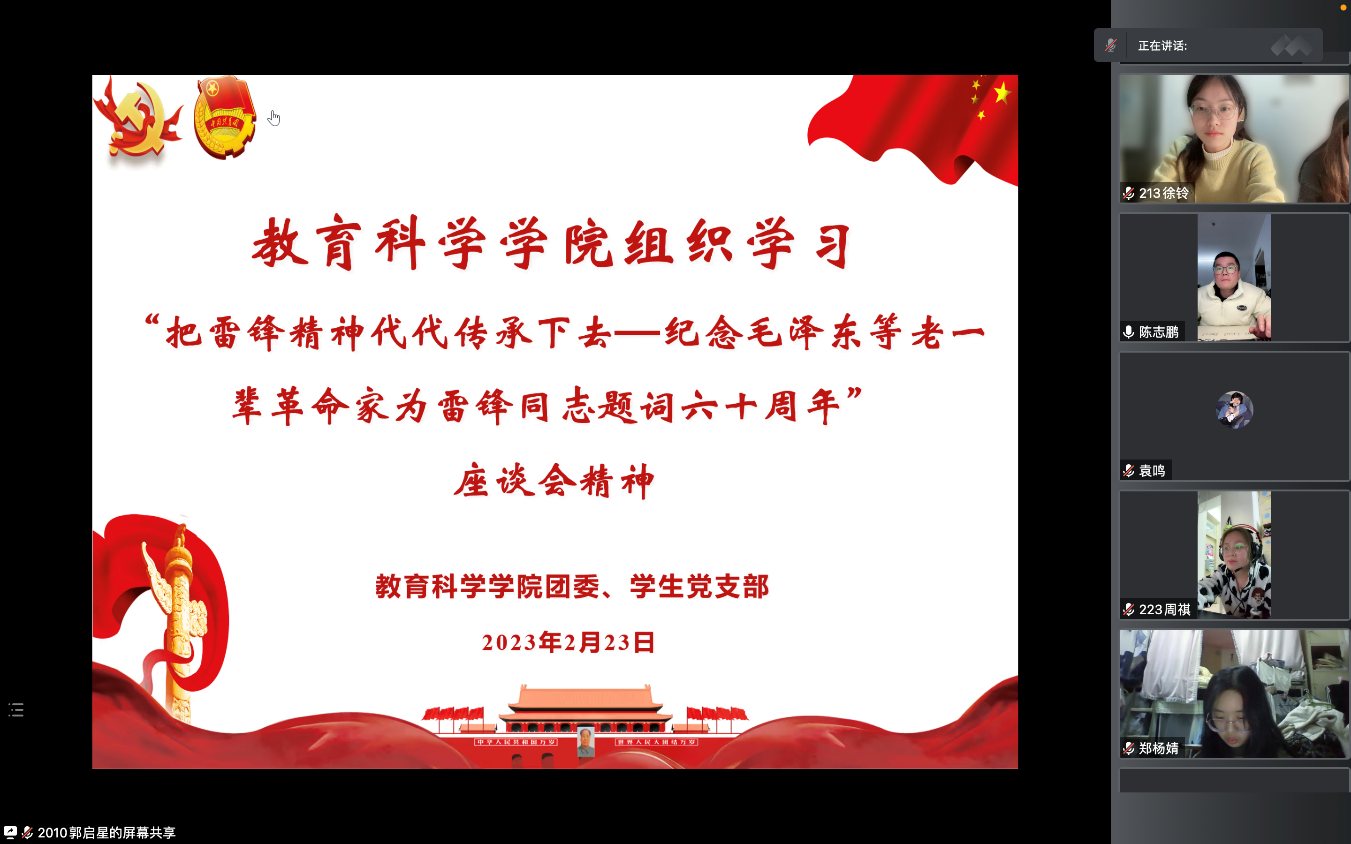 为全面学习贯彻习近平总书记关于深入开展学雷锋活动的重要指示精神,推动学雷锋活动不断走深走实,2023年2月27日,永利23411集团团委组织学习“把雷锋精神传承下去——纪念毛泽东等老一辈革命家为雷锋同志题词六十周年”座谈会精神。