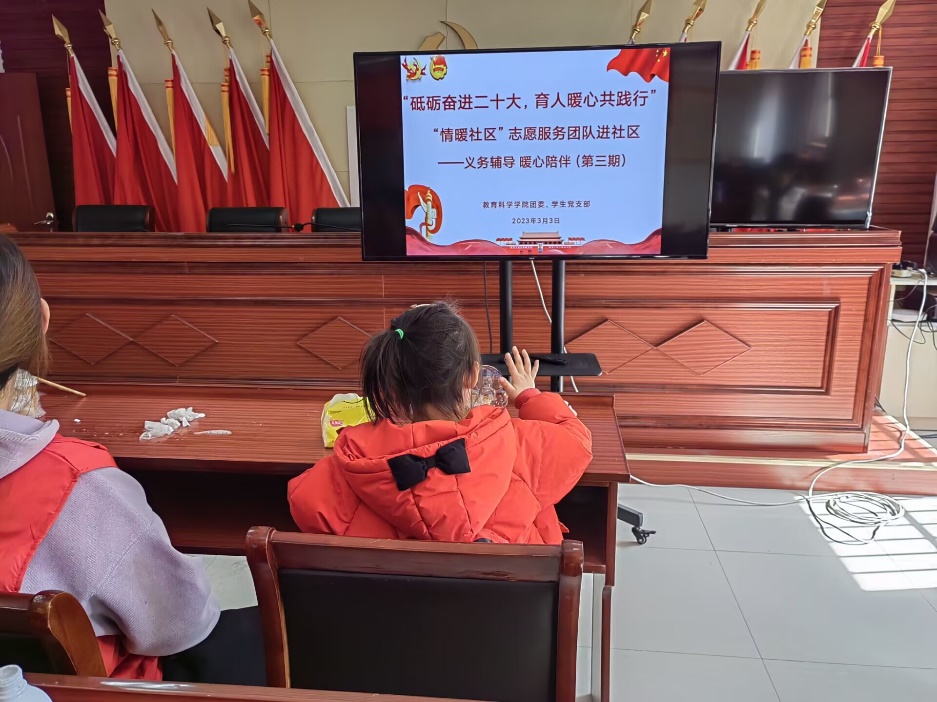 三月春风暖人心,雷锋精神永传承。为进一步弘扬和传承“奉献、友爱、互助、进步”的志愿服务精神,紧扣高校立德树人的根本任务,引领广大青年学子践行雷锋精神,永利23411集团“情暖社区”志愿服务团队深入大洋街道毓龙社区,于3月12日下午1点开展了“老员工进社区,义务辅导功课”课程教育和第一期科学小实验活动。
