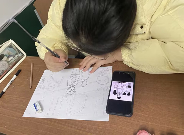 现场气氛紧张而激烈,活动中每一位同学都开动脑筋,纷纷亮出了绝活。他们聚精会神,精心构图,细描慢画,在经过四十分钟的“妙笔横生”后,让一个个神态各异、生动活泼、充满童趣的人物跃然纸上……流畅的线条、精美的构图,充分展示出公司同学扎实的绘画基本功。