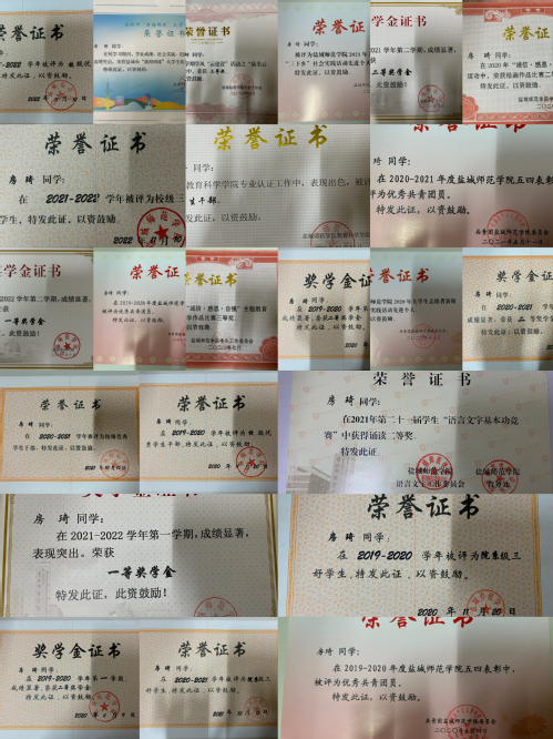 在校期间获得第十一届江苏省师范生教学基本功大赛小学语文组一等奖,盐城市“黄海明珠”老员工奖学金,多次获得校一等、二等奖学金,先后获得校级优秀共青团员,校级优秀员工干部,校级三好员工等荣誉称号。在“诚信·感恩·自强”主题教育活动文学作品比赛、学风“云建设”系列活动、第21届员工“语言文学基本功竞赛”等多项比赛中获校级一、二等奖。