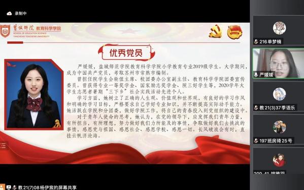 接着,房琦学姐为大家讲述她的两段特别经历。在党旗前宣誓时,她领悟到成为一名中国共产党员,不是努力的终点,而是一个新的开始。从受党关怀长大的懵懂少年到思想成熟的新时代青年,这是一段漫长的道路,更是一条学习的道路,也是一条成长的道路。必须夯实自身修养,更好的为人民服务。在备战江苏省教师基本功大赛期间,她感受到来自老师、舍友的关心照顾。她认为,我们要懂得感恩,在党的领导下,发挥我们青年的力量,抓住机遇、迎难而上、有所担当,有所理想。