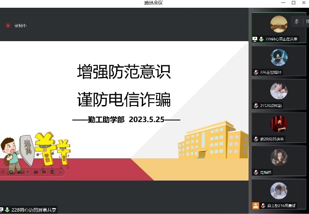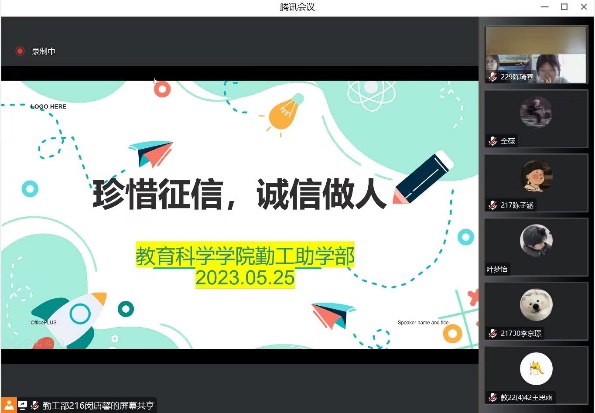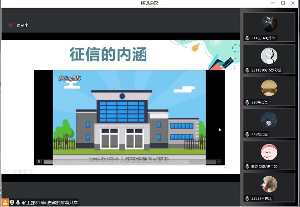2023年5月25日如期召开线上“珍惜征信,谨防诈骗”主题会议,全体建档生聆听主题知识宣讲,增强防范意识,珍惜征信,谨防诈骗。首先活动负责人闵唐馨从“征信知识”、“征信有关的案例”、“我们相关的征信”这三个方面进行“征信”主题宣讲,帮助同学们了解相关要求,做好征信,走出属于自己的花路。