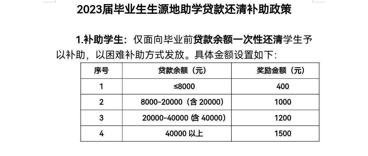 此外,为鼓励毕业生提前还款,学校面向毕业前一次性还清贷款余额的员工予以补助,具体补助金额400元-1500元不等。该政策有效鼓动了贷款毕业生们提前还款的积极性。