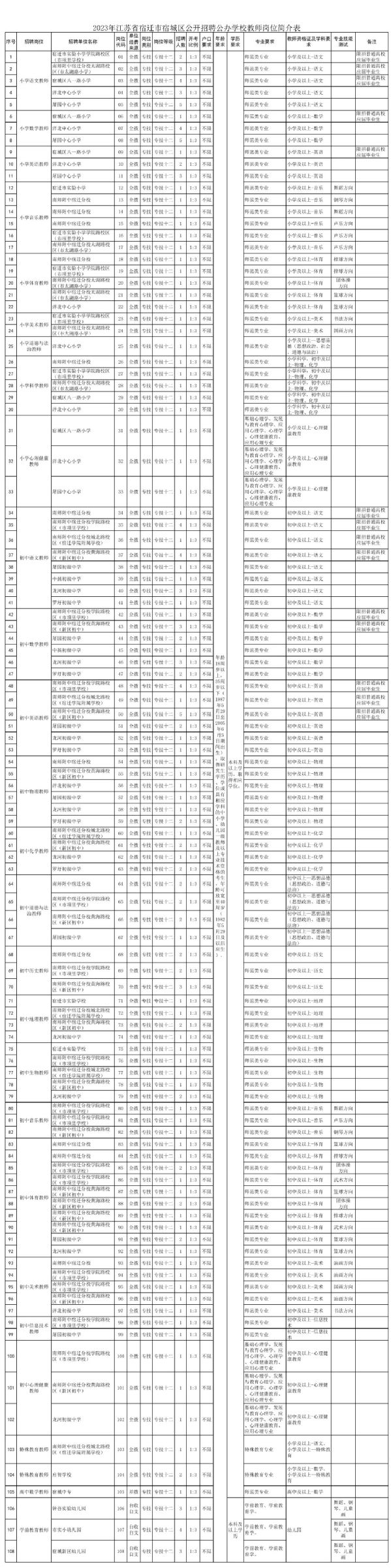招聘单位、招聘岗位、计划招聘人数及相关要求等内容详见《2023年江苏省宿迁市宿城区公开招聘公办学校教师岗位简介表》(附件1,以下简称《岗位简介表》)。