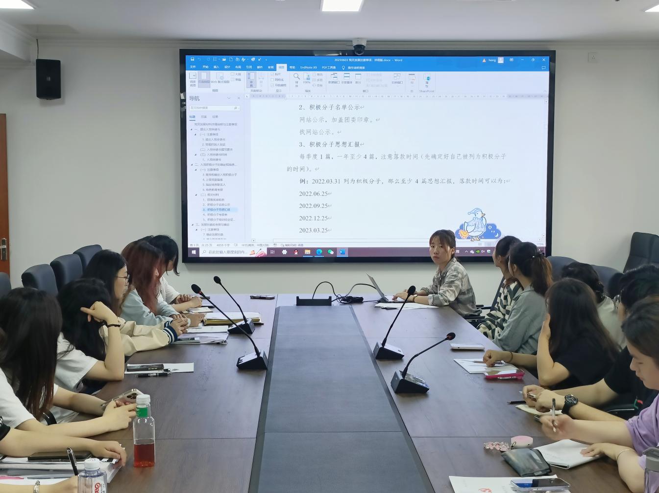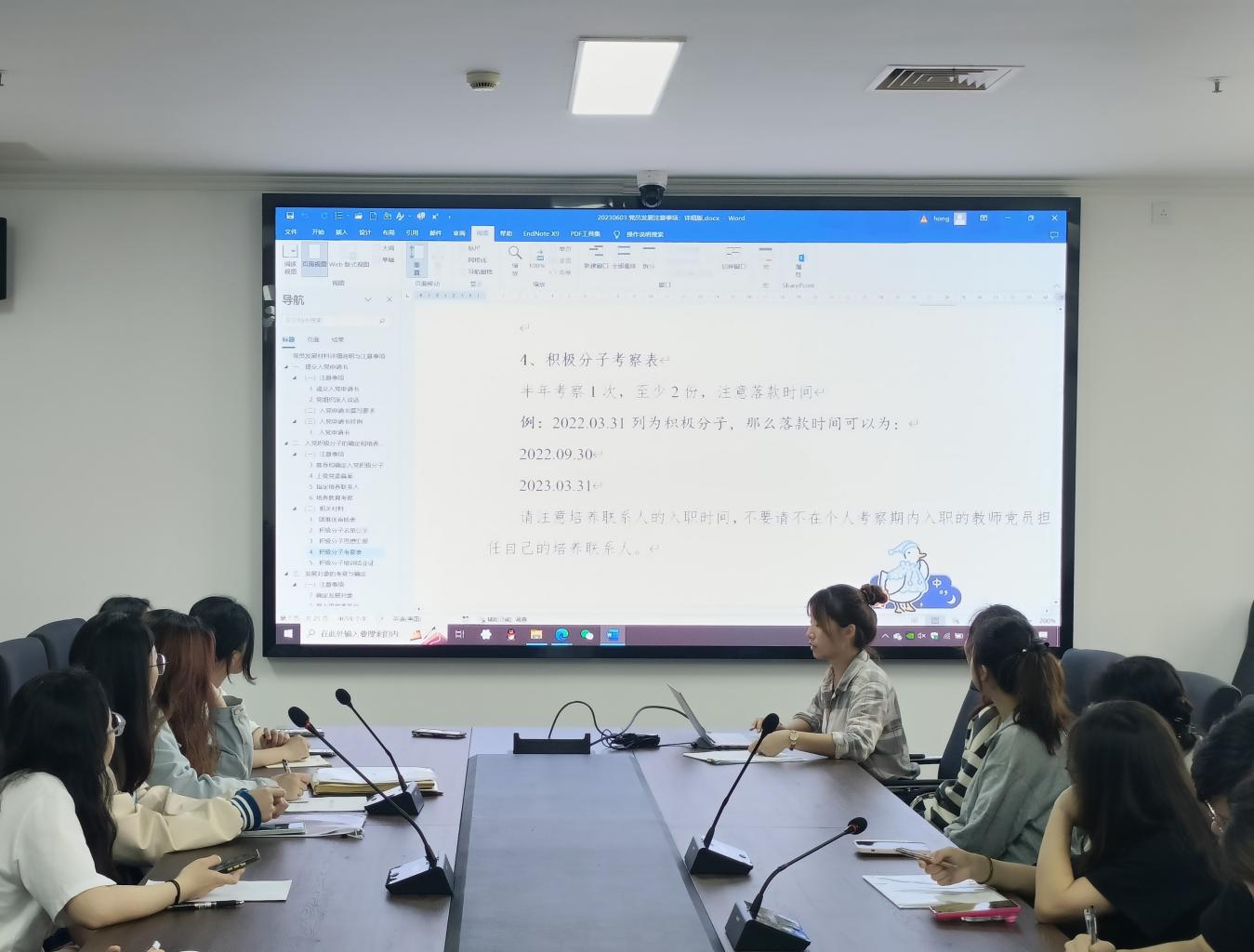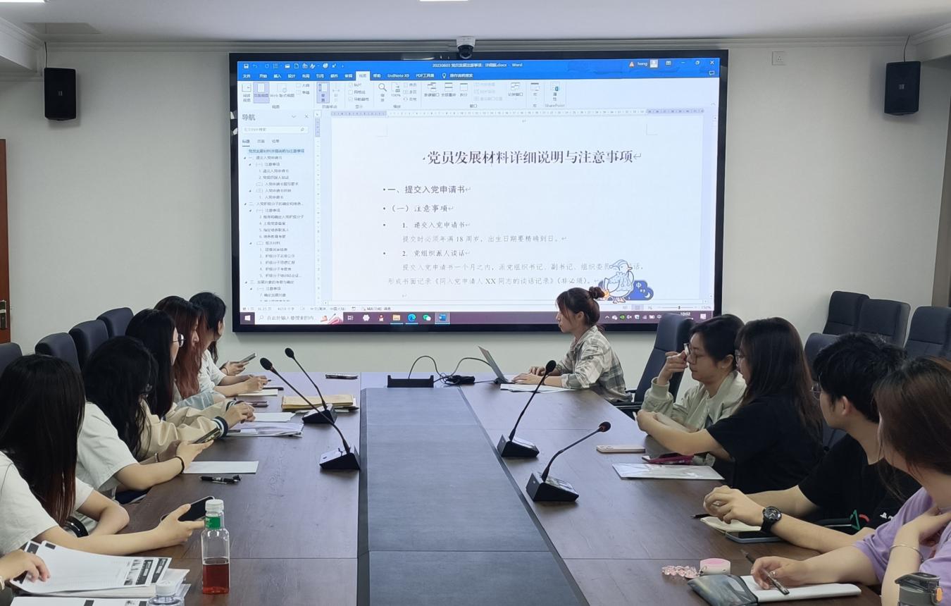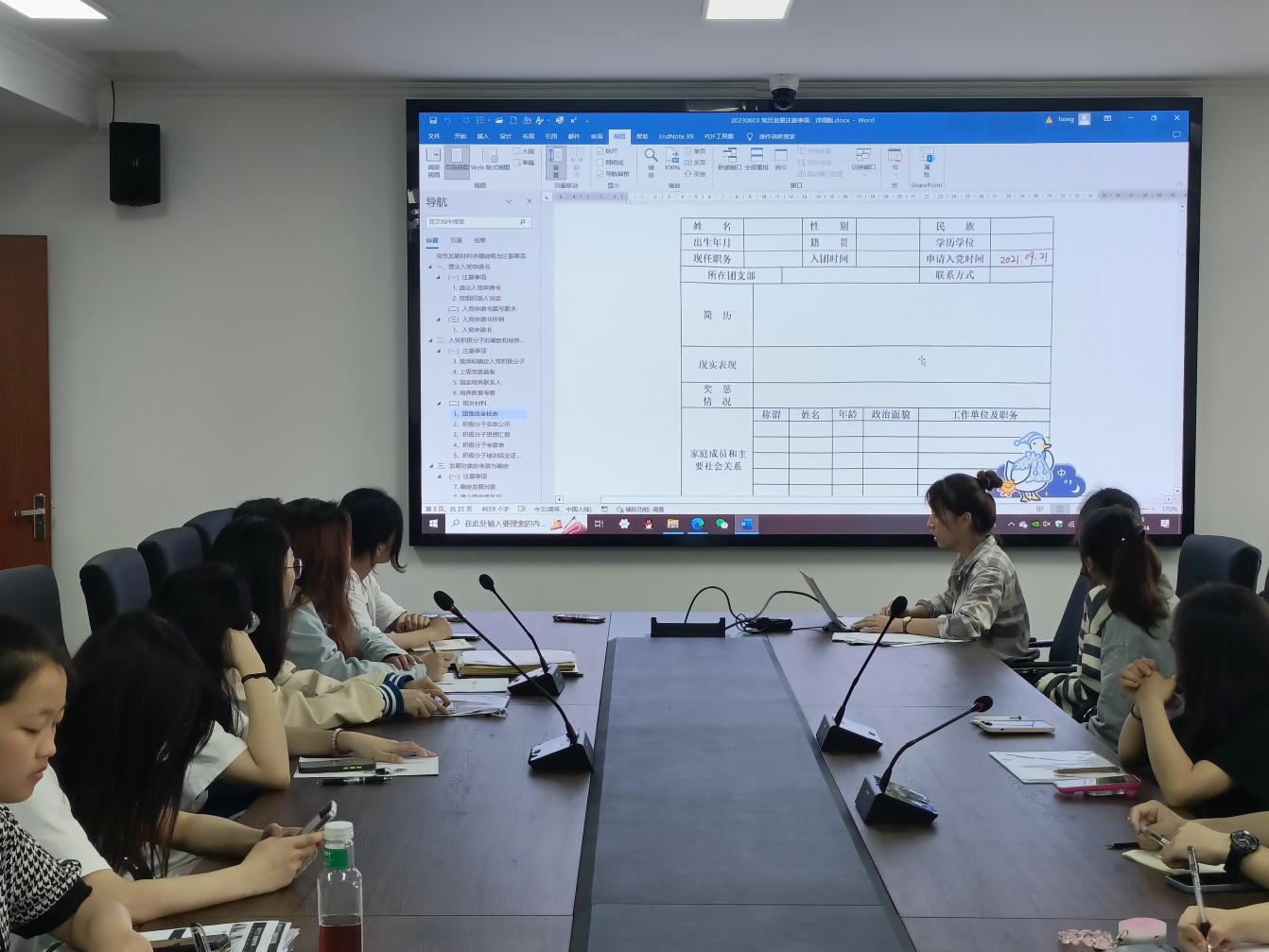 为及时有序做好2023年春学期党员档案审查工作,2023年6月4日上午10:00,永利23411集团在主楼1108会议室开展了2023年春学期党员发展材料审核专题培训会。本次会议由员工第一党支部书记潘虹同志主持,各员工支部负责人参加。