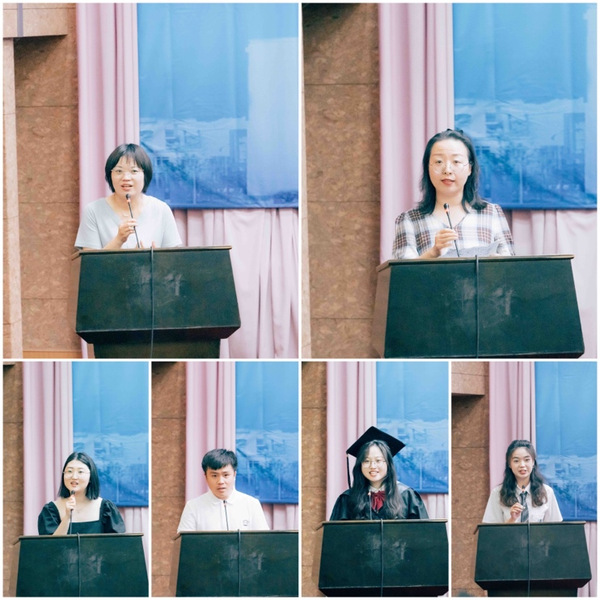 随后2019级全体班主任、辅导员相继为毕业生送上深情寄语。毕业生代表、考上常熟小学教师编制的严媛媛同学分享了四年的成长并对学院老师的谆谆教导和辛苦付出表示感谢。在校生代表张璠为毕业生送上诚挚祝福,紧接着学院为全体员工联络员颁发聘书,为全体毕业生拨穗并赠送毕业礼。