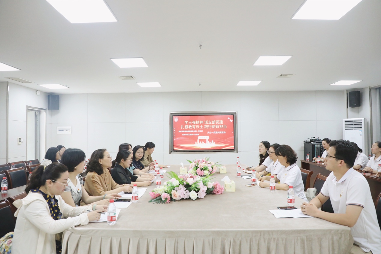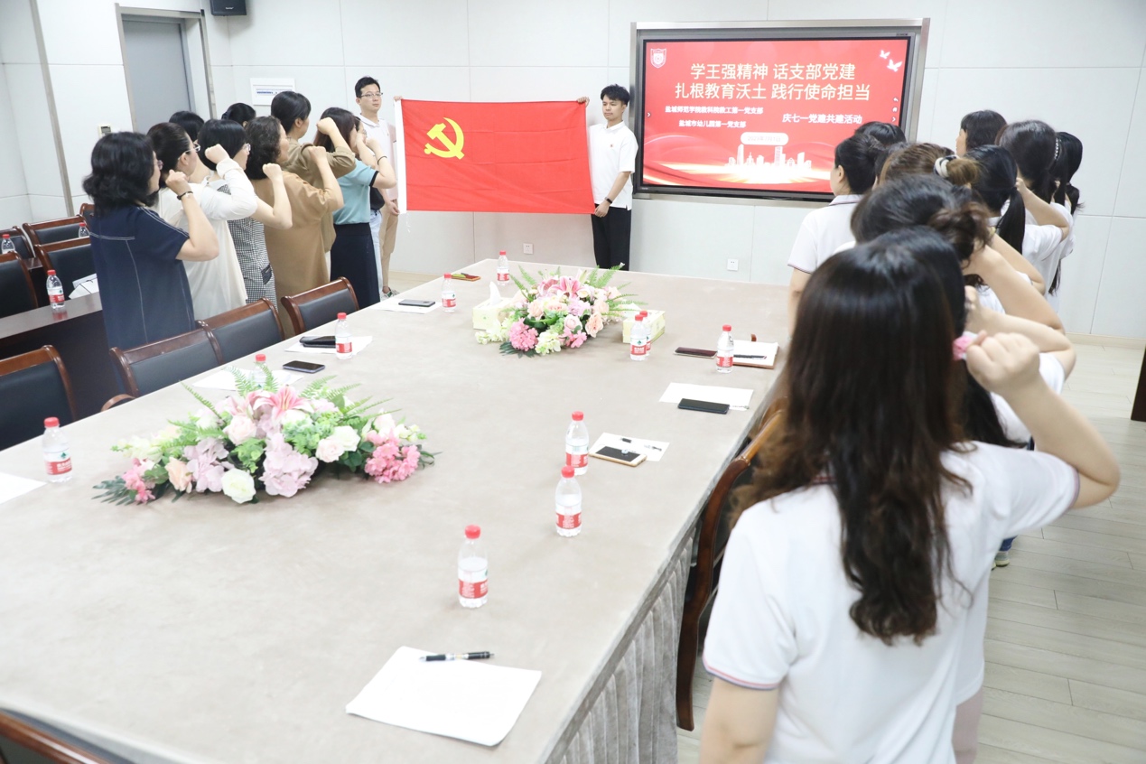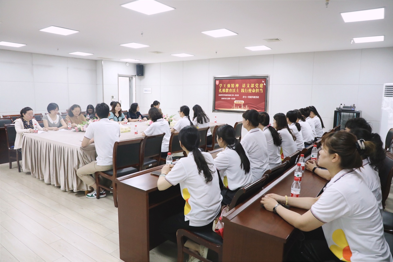 为热烈庆祝中国共产党成立102周年,深入开展学习贯彻习近平新时代中国特色社会主义思想主题教育,进一步加强与市幼儿园的结对共建工作,7月1日上午,永利23411集团教工第一党支部与盐城市幼儿园第一党支部联合举办“学王强精神,话支部党建,扎根教育沃土,践行使命担当”庆“七一”党建共建活动。市幼儿园园长陈莉萍、市幼儿园副园长丁荣秋、市幼儿园第一党支部书记杨柳、教科公司党委书记杨日晨、市幼儿园第一党支部、教科院教工第一党支部全体党员参加了活动。