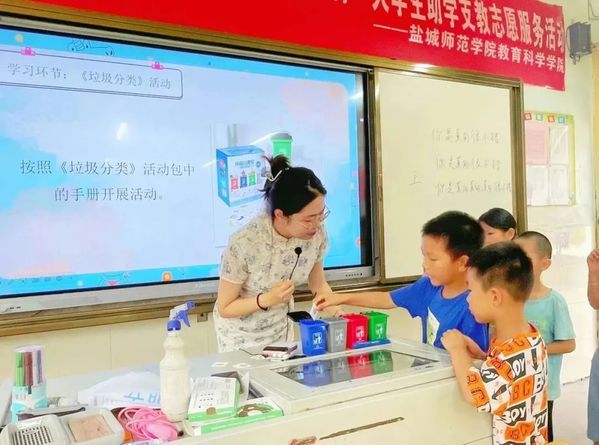 记录我的第一课——我给孩子们上的第一节课是《美丽家园我行动》。在这一节课里,我们使用模拟垃圾桶和几十张画有不同图案的卡片进行模拟垃圾分类。卡片上还配有不同物品的英文读法,使孩子们在动手实践中学习知识,感悟环境保护的重要性。“除了垃圾分类,大家还有哪些保护环境的做法呢?”临近下课时,我这样问道。“少用塑料袋,少用一次性的东西”“每顿都做到光盘,减少浪费”“开空调的时候尽量不开很低的温度”孩子们七嘴八舌,眼睛忽闪忽闪的,里面的光亮就像是夜空里最耀眼的星星。