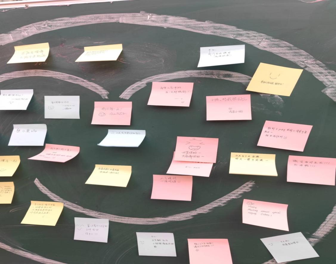 在“心情交流站”活动中,员工通过画出笑脸、无表情的脸或哭脸,表达内心的情感状态,并将便签贴到对应展板上。另外,学院准备了“安慰盲盒”,员工可以在盲盒中抽取或放入一张鼓励便签,传递温暖,获得慰籍。