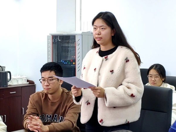 讨论接近尾声,潘虹对此次会议作出总结。她指出,希望大家能不断提高自身素质,做到在其位谋其事,积极主动将本次讨论的内容与实践工作结合起来,让党纪党规、依法治国理念和社会主义核心价值观内化于心、外化于行,真正为同学、学校、国家做贡献。