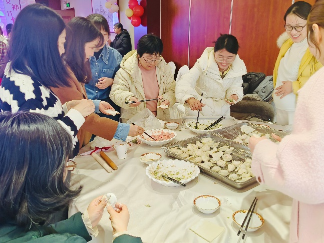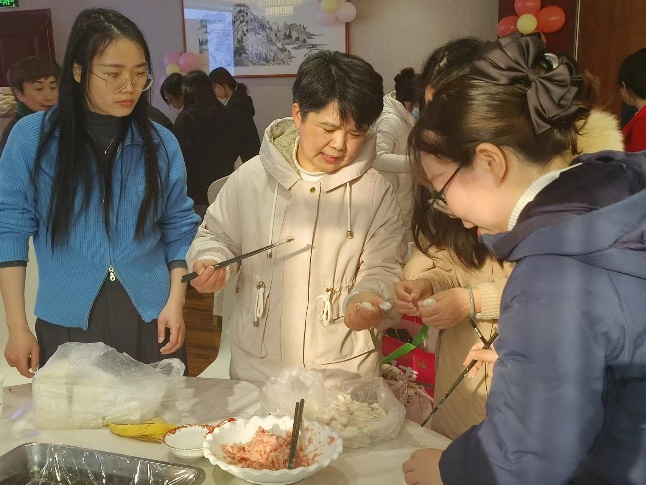 欢乐团建,巾帼展风采。活动现场氛围温馨且欢快,参与活动的女教职工们齐聚一堂,有的负责和面,有的负责擀皮,有的负责调制馅料,大家分工合作,八仙过海各显其能。经验丰富的老师还不忘教授年轻老师包饺子的技巧和经验,共同提升手工技能。活动现场每一位参与人员都热火朝天地投入其中,一双双灵巧的手把欢乐、希望与祝福都填进了每一道褶子里,融在了圆鼓鼓的饺子中。