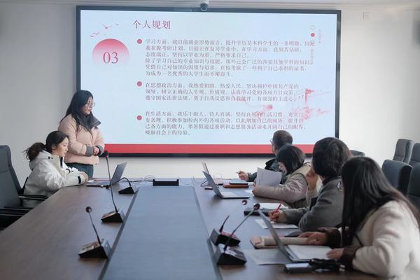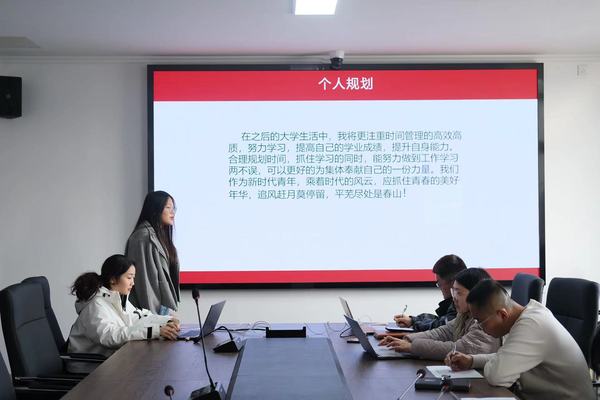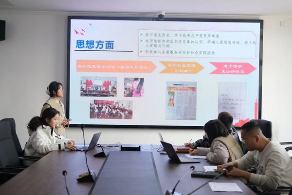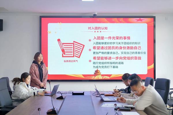 首先,每位同学上台展示 PPT 并进行三分钟的演讲,陈述个人优缺点、学习与任职情况、为班级所做的贡献以及入团动机,表现出积极向团组织靠拢和成为共青团员的决心和毅力,随后由面试官进行提问,进一步了解同学们的经历和对未来生活、学习的展望,涵盖多个方面和模块,全方位考察入团发展对象的个人综合素质并对相关问题作出了详细解读,提出针对性的指导意见。