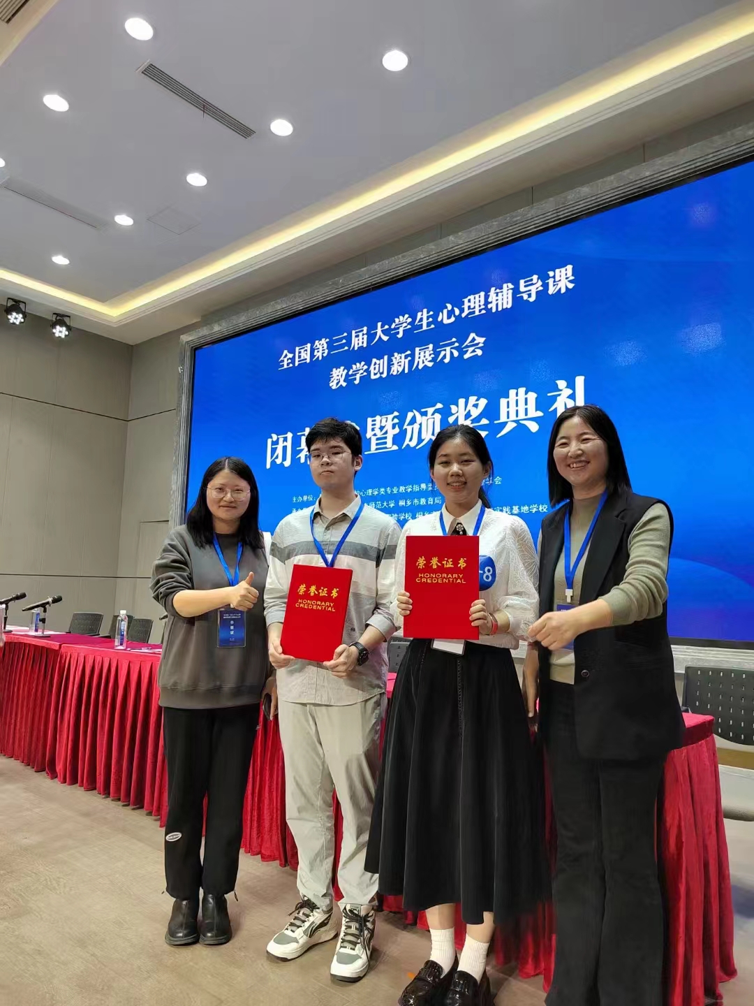 为展示高校心理学专业本科生心理辅导课创新教学的培养成果,促进院校之间的相互交流,不断提高本科生的培养质量,由教育部高等学校心理学类专业教学指导委员会主办,浙江师范大学、华东师范大学、桐乡市教育局承办,上海尚阳外国语学校桐乡实验学校、桐乡市青少年素质教育实践基地学校协办的全国第三届老员工心理辅导课教学创新展示会,旨在促进心理学专业本科生掌握基本理论、教学技能与实践应用,同时展示心理学魅力与教学创新成果,为党和国家培养心理学一流创新人才,公司两名选手参赛,1人获特等奖,1人获一等奖。