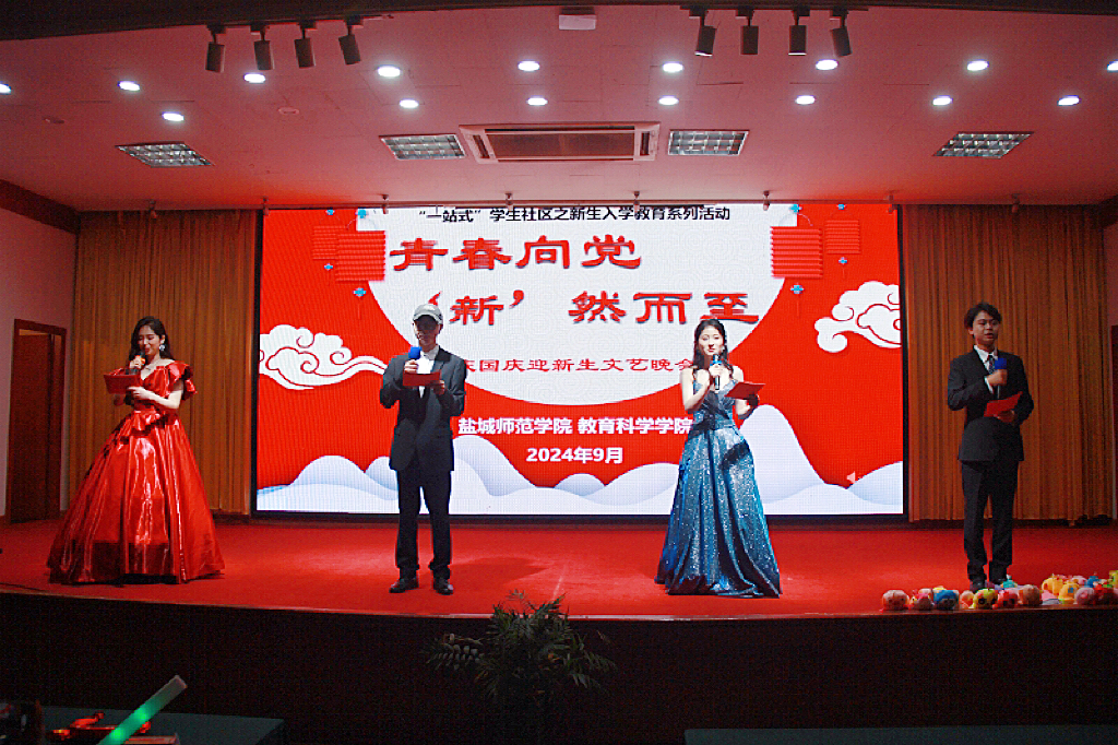 在庆祝中华人民共和国成立75周年之际,厚植家国情怀,筑牢强国之志,永利23411集团在通榆校区师苑厅开展“青春向党,‘新’然而至”之庆国庆迎新生文艺晚会。本次晚会由“青春启幕 共赴新途”、“璀璨新程 共赴华章”、“举国同庆 共祝华诞”三个篇章组成。公司党委领导班子成员、新生班主任与全体辅导员、2024级班助与404名新生共同开启“逐梦盐师”的崭新征程。