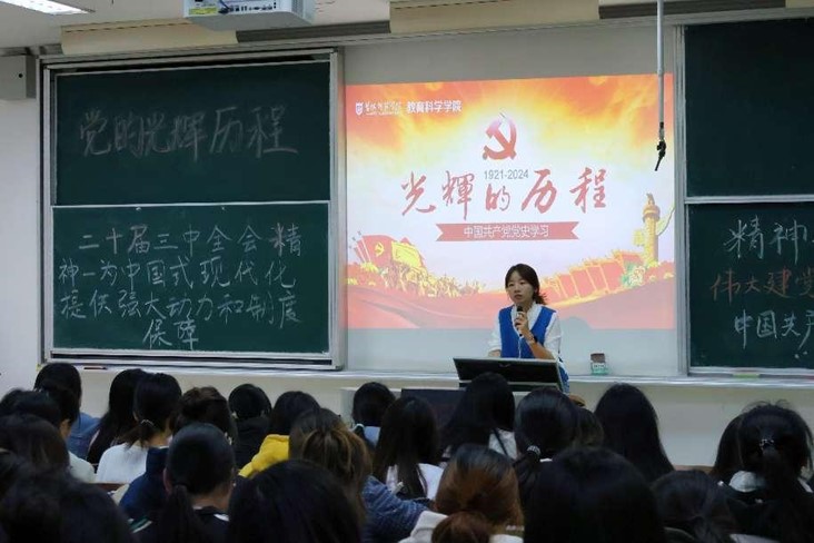 潘虹从“伟大建党精神的具体内涵”“伟大建党精神的重要意义”“当今社会如何弘扬伟大建党精神”三方面出发,引导同学们重温党的奋斗历程。此外,她还带领同学们再次重温了党的二十届三中全会内容,梳理了习近平总书记会上提出的重要精神,她强调,我们要认真学习贯彻党的二十届三中全会精神,提升自身的责任感和使命感,把学习成效转化为立足本岗、做好本职的能力本领,切实把学习成效转化为推动社会高质量发展的强大动力。