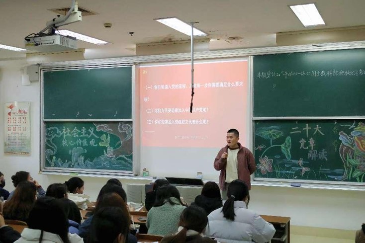 陈志鹏从党章的功能定位、基本架构、主要内容出发,对党章进行了概述。他重点向同学们阐明了党员的权利与义务,深入浅出地解析了党章、准则、条例、规则的具体含义和党内法规制度建设由点到线、由线到面、由面到体的发展历程。陈志鹏强调,要牢固树立党章意识,把党章作为加强党性修养的根本标准,切实了解党员的权利与义务,把党章的各项规定要求落实到学习生活中。