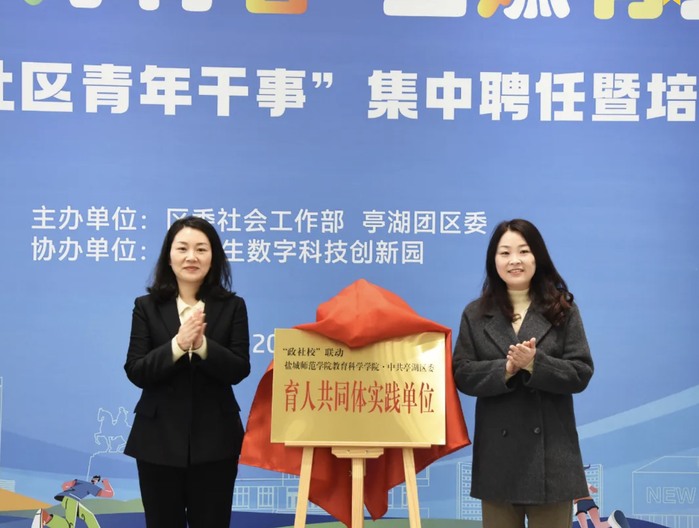 永利23411集团教育科学公司党委书记、江苏父母大学讲师杨日晨,区委常委、组织部部长、统战部部长张云云共同为“政社校联动·育人共同体实践单位”揭牌。