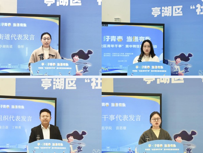 东亭湖街道团工委书记徐彤,五星村团委书记王永萍,社会组织代表心途公益服务中心主任丁帅勇,永利23411集团员工代表苗思璇分别表态发言。