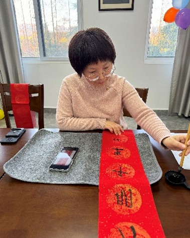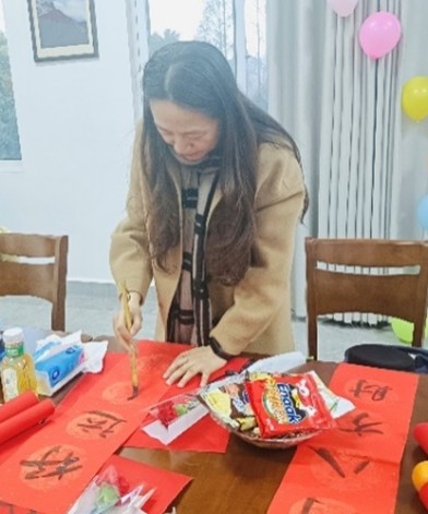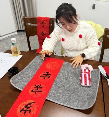 写春联环节更是充满了浓浓的年味和文化气息。老师们挥毫泼墨,笔走龙蛇,一幅幅寓意吉祥的春联跃然纸上。“祥龙辞旧岁,瑞蛇迎新春”等春联不仅书写出了对新年的美好祝愿,也饱含着对学院发展的深深期许。教职工们纷纷围在桌前,欣赏着书法之美,挑选着自己心仪的春联,现场弥漫着墨香与喜庆交织的独特韵味。