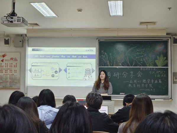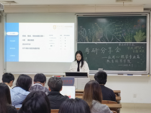 为助力应用心理学学子在考研新征程上校准罗盘,扬帆破浪,永利23411集团在4月9日于主楼A207教室开展应用心理学专业的考研经验分享会。本次分享会以双轨并行的创新视角,通过国内外升学路径的全方位解构,为员工照亮研途迷思。分享会邀请到考研至湖北大学的袁鸣学姐与成功申请爱丁堡大学的倪倩芸学姐,两位学姐结合自身经历,以生动的案例与风趣的讲述,为应用心理学专业的学弟学妹们揭开了国内外升学规划的双重图景。