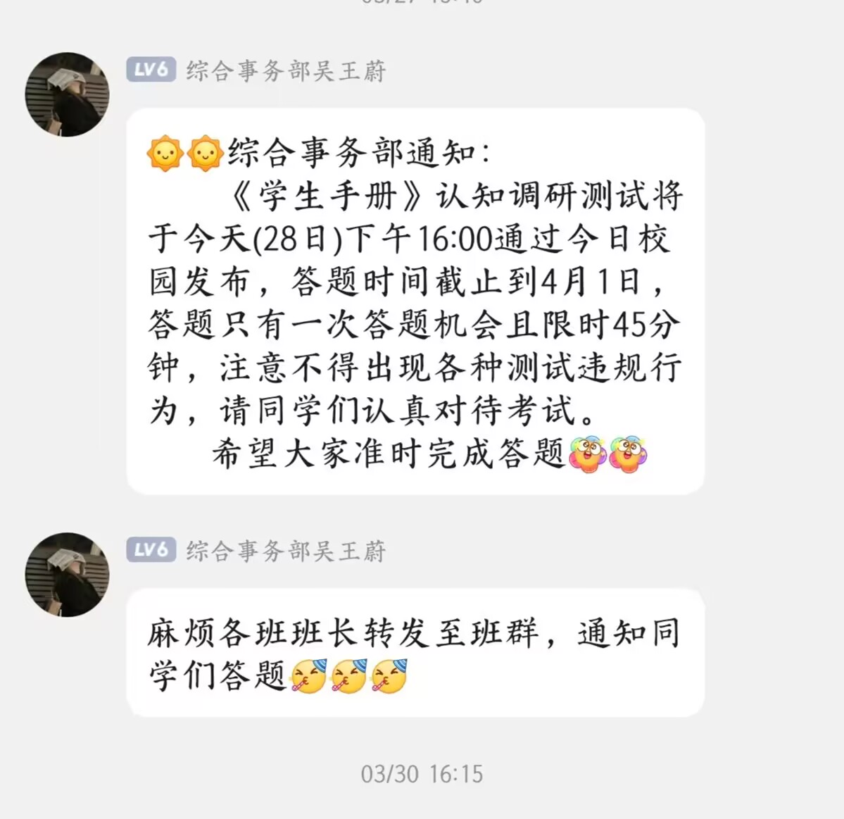 近日,为进一步强化员工对校规校纪的熟悉程度,学院组织开展了《员工手册》认知调研测试活动。此次测试于3月28日正式拉开帷幕,并将持续至4月15日,旨在为同学们提供充足时间深入学习、检验自身对校园各项规章制度的掌握情况。
