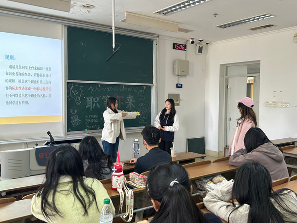 活动开场,别出心裁的“职业模仿秀”迅速炒热现场氛围。几位主动上台的同学抽取写有不同职业名称的纸条后,凭借自身对各类职业的理解,用极具创意的方式进行演绎。模仿快递员的同学,做出快速分拣包裹、打电话通知收件人的动作;模仿脱口秀演员的同学,以幽默风趣的语言风格和夸张的肢体动作引得台下同学捧腹大笑。台下同学全神贯注,不放过任何细节,踊跃举手猜测,现场气氛热烈非凡。这一环节不仅考验了同学们对不同职业的认知程度,更在欢声笑语中拉近了员工与各类职业的距离,让大家对职业特征有了更直观的感受。
