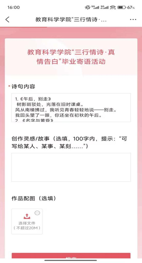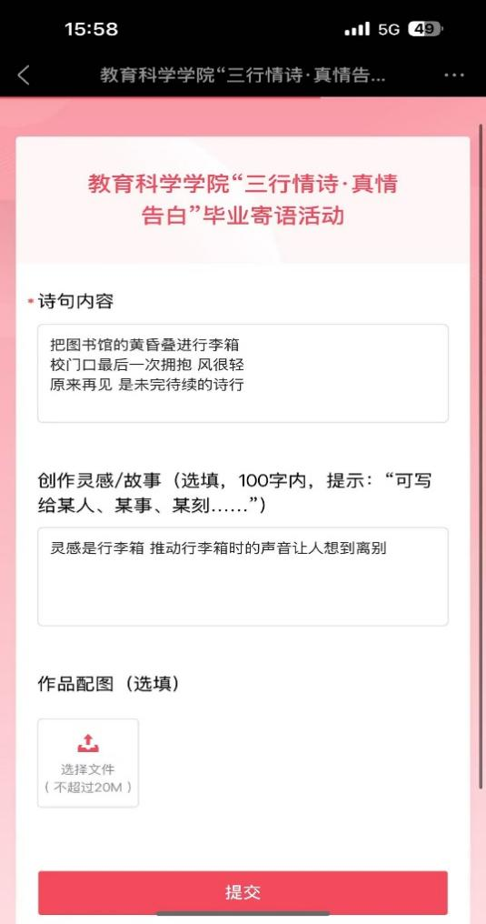 活动得到毕业生积极响应,作品围绕“感恩母校”、“致敬师长”、“同窗情谊”等主题展开。有毕业生写道:“把图书馆的黄昏叠进行李箱/校门口最后一次拥抱/风很轻,原来再见是未完待续的诗行”,将离别场景化作动人诗篇;“母校是一本泛黄的诗集/页页写满不舍/我在她怀里长成了温柔的风”,则以诗意的比喻道出对母校的眷恋。
