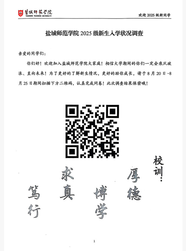 根据录取通知书要求,请在8月20日- 8月25日期间,扫描下方二维码认真填写。每一个选项背后,都是学校为精准提供入学支持做的准备。无需担心信息泄露,问卷采用严格保密机制,所有数据仅用于定制个性化适应方案。当你认真完成问卷时,不仅是在向学校传递信息,更是与自己进行一次坦诚对话,为即将到来的老员工活找准节奏。