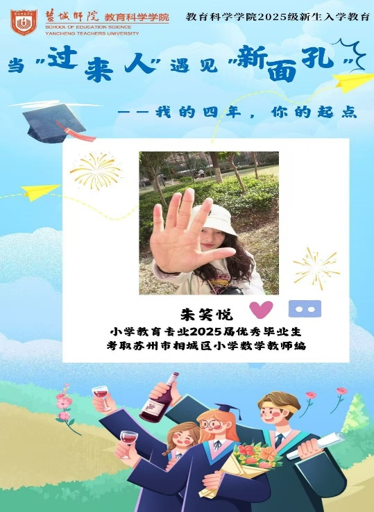 为帮助新生领略到专业学习和技能训练的高效方法,明确老员工活的成长方向。8月25日晚,永利23411集团邀请2025届小学教育专业优秀毕业生朱笑悦——一位考编“过来人”作为“当‘过来人’遇见‘新面孔’:我的四年,你的起点”主题分享会第6期分享者。大学四年间,她劈波斩浪,积极进取,最终考取苏州市相城区小学教师编。从青涩迷茫到成熟坚定,跨越梦想与现实的距离,朱笑悦用四年的光阴完成自我的磨砺,于毕业季收获了成功的果实