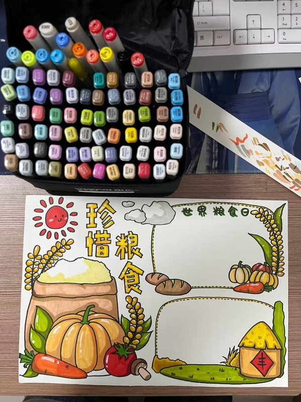 在本次活动中,同学们以画笔为媒,将“珍惜粮食”的朴素道理融入生动创作。黑板报上沉甸甸的稻穗与“粒粒粮食皆珍贵”的倡议相映成趣,手抄报中艺术化的“节约粮食”字样与灵动的蝴蝶水波相得益彰。大家围绕“世界粮食日溯源”“农耕不易”等主题,从满载稻穗的粮袋、饱满的南瓜到童趣的太阳、丰收的粮囤,通过从黑白线稿到色彩斑斓的创作过程,亲身体验和再现了粮食从田间到餐桌的完整历程。这不仅仅是一次艺术实践,更是一堂深刻的生命教育课——让“谁知盘中餐,粒粒皆辛苦”的古训在笔尖焕发新生,使节约粮食的理念在色彩勾勒中升华为情“光盘行动”的自觉,在潜移默化中为青年学子奠定了珍爱劳动成果、崇尚节俭的价值基石。