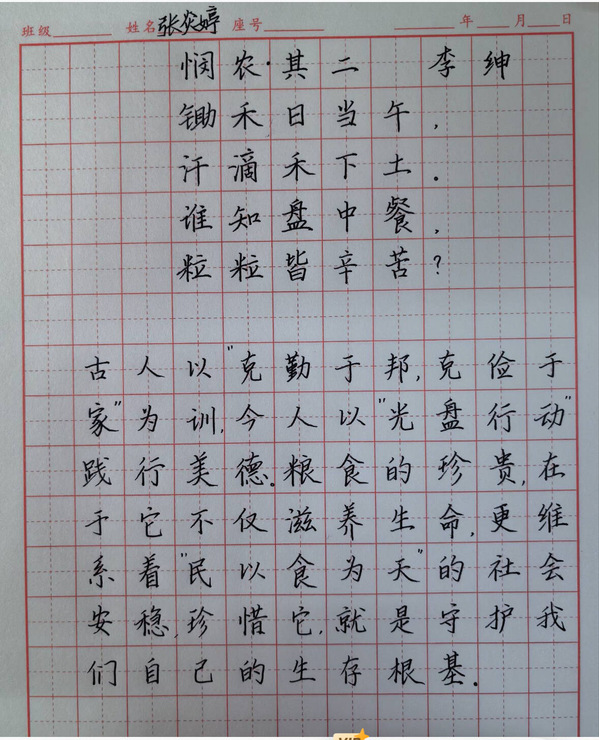 在簌簌粉屑中,农耕文明的厚重底蕴缓缓铺展;在银钩铁画里,对田间劳作的敬畏之情静静流淌;在墨韵淋漓处,勤俭节约的精神风骨傲然挺立。当笔尖与纸面摩挲,书法艺术的刚劲与柔美化作节约粮食的自觉行动;当千年翰香邂逅世代相传的节俭智慧,方寸笔墨不仅锤炼了未来教师的教学基本功,更让“半丝半缕恒念物力维艰”的箴言随墨汁浸润学子心田。