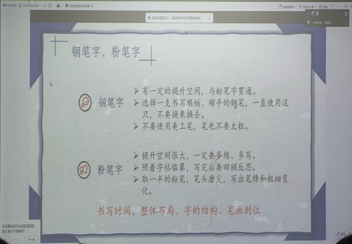 接着,小学数学组杨欣怡结合自身经验拆解“两字”技巧——钢笔字固定用顺手钢笔,粉笔字多练多复盘、截半支笔磨尖出笔锋,同时需注意书写时间、布局及笔画到位,避免错别字;教学设计则要紧扣课标,贴合小员工认知规律。
