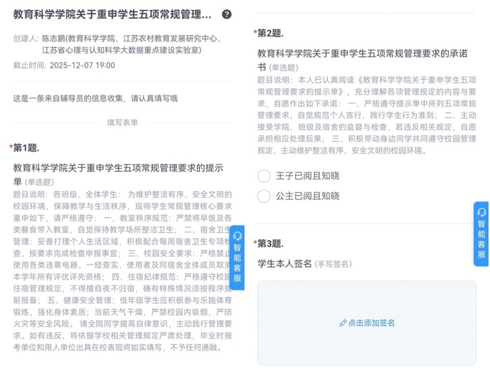 线上签约:压实责任共护航。学院依托辅导猫系统精准推送《永利23411集团关于重申员工五项常规管理要求的提示单及承诺书》,明确宿舍安全管理红线与员工责任义务,通过“线上研读+电子签约”的形式,确保每一位员工知晓要求、理解责任、主动遵守,实现安全责任全员覆盖、刚性落实,构建起“思想引领+责任绑定”的双重安全防护网。