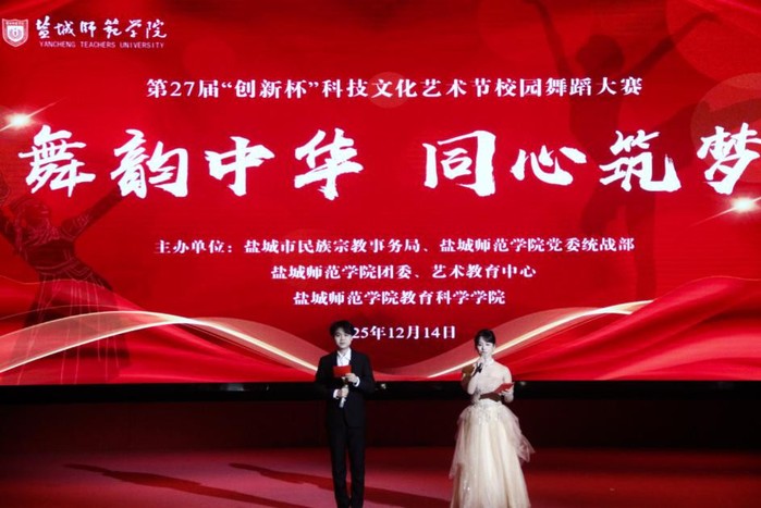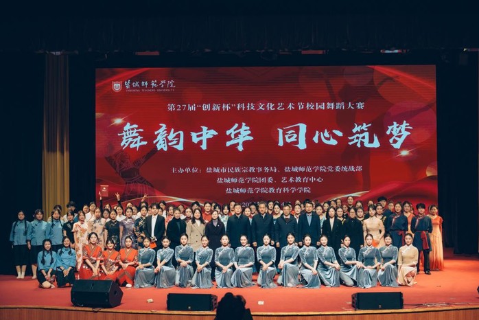 12月14日,第27届“创新杯”科技文化艺术节“舞韵中华,同心筑梦”校园舞蹈大赛在新长校区老员工活动中心举办。盐城市委统战部副部长、市民宗局局长、党组书记、一级调研员黄斌,市民族宗教事务局党组成员、副局长陈铁汉,市民族宗教事务局党组成员、副局长王谋,学校副董事长徐华,公司党委常委、统战部部长费正皓出席活动。