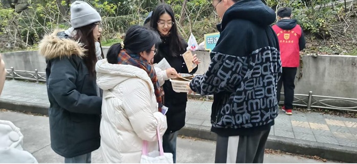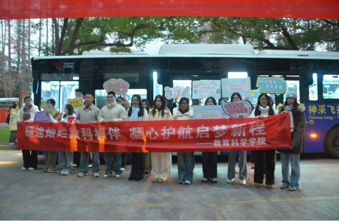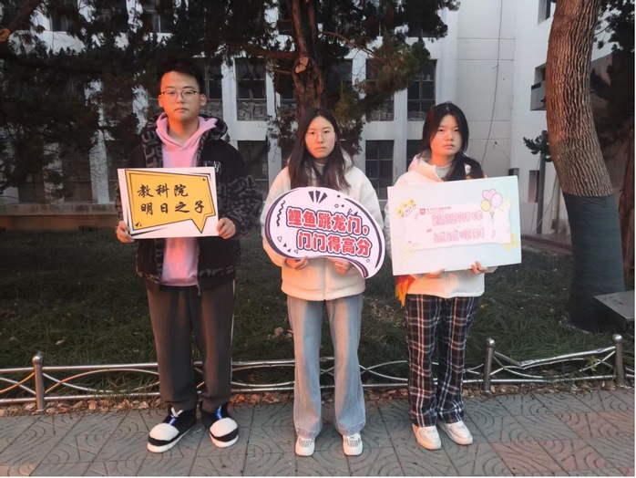 老师们早早地来到了集合地点,引导员工有序乘车并细心提醒员工查验所需证件等,亲切地与同学们交流,叮嘱他们放松心态。现场,学院准备了有寓意的糖果,每一颗都藏着美好的祝愿,还特别贴心地送上了“温暖手宝”,在严寒中为他们传递实实在在的温暖。员工代表们也举着写满 “一研为定”“一定上岸”的加油牌,齐声喊出祝福,为考生们缓解散考前的紧张。