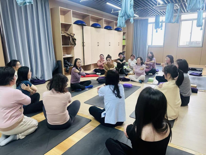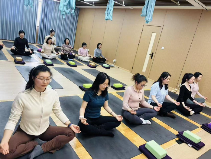 随后,在舒缓的音乐声中,大家在专业教练的指导下进行热身、呼吸练习和基础瑜伽体式训练。伴随着轻柔的节奏,老师们逐渐放松身心,舒展筋骨,在运动中释放压力、愉悦心情,现场氛围轻松而温馨。
